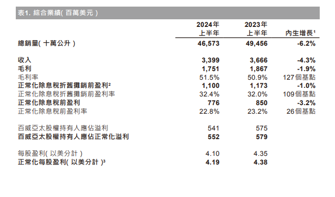 8月1日上午,百威亚太控股有限公司(以下简称:百威)发布了2024年上半年及第二季度财报。财报显示,2024上半年,百威啤酒销量为4660万百升啤酒,同比减少6.2%;收入为33.99亿美元(约合245.86亿元人民币),同比減少4.3%,按呈报基准计減少7.3%;百威亚太股权持有人应占溢利5.41亿美元,同比减少5.91%。(约合39.13亿元人民币)。
