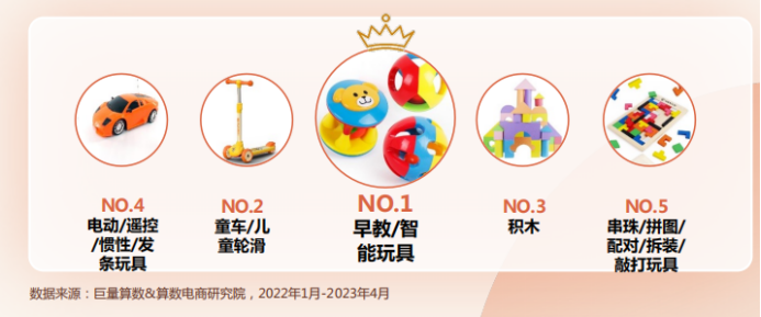 在抖音平台上(巨量算数&算数电商研究院2022年1月-2023年4月),益智玩具相关的内容播放量在所有儿童玩具细分类目中遥遥领先,且智能公仔/娃娃、积木、拼图/拼板等适用于不同年龄阶段儿童且带有“益智”属性的玩具,播放量均处于靠前位置,可见“益智性”已经成为用户对儿童玩具的“刚需”。
