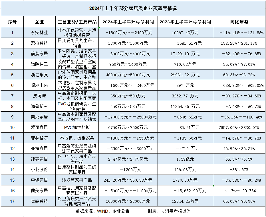 但对大部分家居企业而言,或许“前途是光明的,道路是曲折的”。从多家家居企业最新发布的2024年上半年业绩预告来看,在房地产持续调整、消费疲软、出海不确定性风险等多方面因素影响下,家居公司出现普遍性亏损或净利润下降的情况。当市场扩容有限,内卷愈发激烈。继价格战和在设计、智能化等多方面开“卷”后,渠道竞争也如火如荼。在刚结束的2024年第26届中国建博会(广州)上,多家定制家居企业开始推轻资产、轻运营模式,如索菲亚推出“共创事业合伙人模式”,欧派家居对经销商推出包含建店帮扶、运营帮扶等内容的七大帮扶政策。“得渠道者得天下”。家居行业进入加速洗牌的大变革时期,渠道变革也正拉开大幕。据WIND数据,截至7月24日15时,17 家家居类上市公司已发布2024年上半年业绩预告,其中7家为亏损,9家同比2023年上半年出现负增长。美克家居、曲美家居亏损额度最大。今年上半年,美克家居预计亏损1.7亿元至2.5亿元,曲美家居预计亏损1.1亿元至1.5亿元。不过,与美克家居同比亏损额度增加不同,曲美家居较2023年同期减亏652.90万元到4652.90万元,同比增加 4.17%到29.73%。归母净利润同比下降的9家企业中,德尔未来、美克家居是家居企业中降幅最大的两家。德尔未来的主营业务为木地板、定制家具及密度板等大家居产品的研发、生产和销售,2023年上半年盈利297万元,今年上半年预计亏损1600万元至2400万元,净利润同比下降638.72%至908.08%。在去年上半年亏损8666.62万元的基础上,美克家居的亏损额度继续扩大,净利润同比下跌96.15%至188.46%。而在2020年至2023年,美克家居净利润连续四年同比下降,2022年、2023年连续两年出现上亿元的亏损。