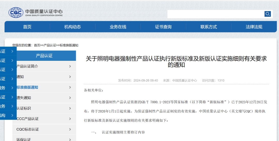 照明电器强制性产品认证依据的GB/T 7000.1-2023等国家标准(以下简称“新版标准”)已于2023年12月28日发布,将于2026年1月1日起实施。为保证强制性产品认证制度的有效实施,中国质量认证中心(英文缩写CQC)9月26日发布了《关于照明电器强制性产品认证执行新版标准及新版认证实施细则有关要求的通知》: