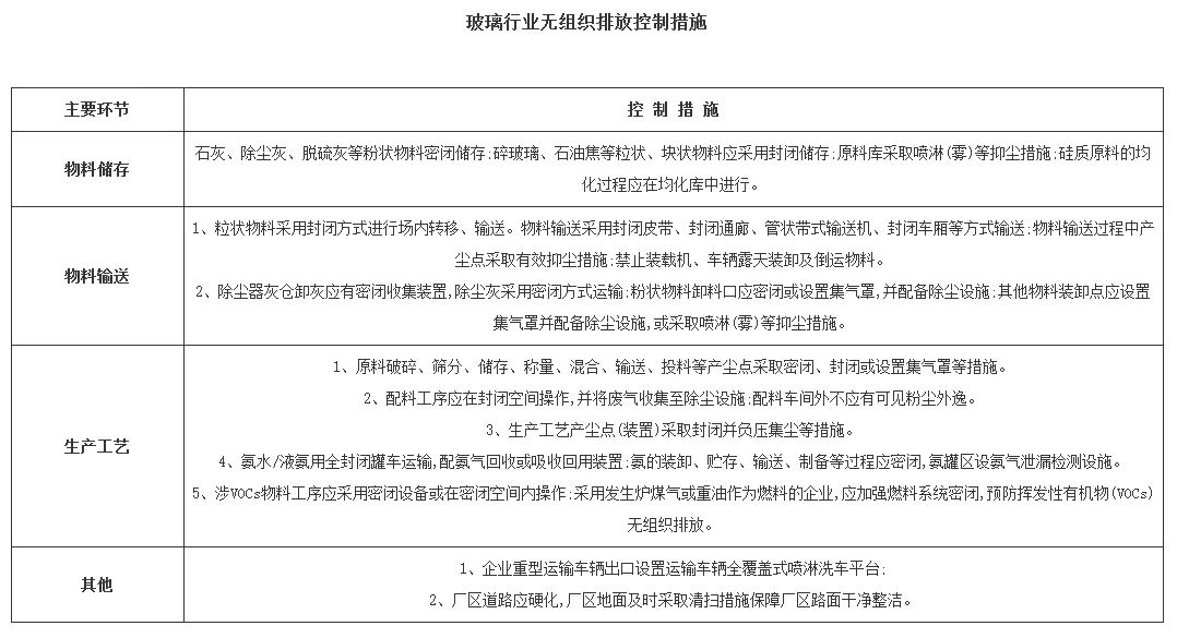 按照分类施策、属地负责、分步实施的原则,开展玻璃行业(平板玻璃、光伏压延玻璃、日用玻璃等企业)综合整治,推动玻璃熔窑能源清洁化改造,提升玻璃熔窑生产能效水平,推进烟气深度治理,提升行业环保绩效水平,推动行业绿色低碳高质量发展。2026年底前,全省8家平板玻璃企业基本完成综合整治工作;2028年底前,光伏压延玻璃、日用玻璃等企业基本完成综合整治工作(具体指标要求见附件1和2)。(一)优化调整产品结构。落实《产业结构调整指导目录》(2024年本),通过综合手段依法依规淘汰落后产能。发挥能效、环保、质量、安全、物耗、水耗等标准作用,引导能耗高、排放强度大的低效产能有序退出。加快平板玻璃产品的低碳化、制品化发展。鼓励长利玻璃等行业龙头企业实施兼并重组,推动武汉长利玻璃搬迁工作。列入淘汰退出计划的企业或设施不再要求实施提标升级改造。(二)提升能源清洁化水平。强化玻璃行业工艺升级、能源替代等综合性措施,降低企业污染排放和碳排放强度,推进重点企业清洁生产审核,2025年底前重点企业完成一轮清洁生产审核。对以石油焦、煤制气等为主要燃料的玻璃熔窑,加快推进天然气、电等清洁能源替代。2026年底前,平板玻璃企业基本完成天然气、电气化能源改造;2028年底前,鼓励位于天然气管网覆盖区域的日用玻璃企业完成煤气发生炉淘汰工作,推动玻璃行业天然气稳定供给。(三)提高窑炉生产能效水平。通过采用玻璃熔窑全保温、熔窑用红外高辐射节能涂料技术、玻璃熔窑全氧燃烧以及纯氧助燃工艺等途径,提高玻璃熔窑能源利用效率,提升窑炉节能效果,优化玻璃熔窑、锡槽、退火窑结构和燃烧控制技术,推进电气自动化改进、新能源替代技术运用、智能工程化改造等。到2025年,玻璃行业能效标杆水平以上产能比例达到20%,能效基准水平以下装备基本清零,行业节能降碳效果显著,绿色低碳发展能力大幅增强。(四)污染治理设施提标改造。玻璃行业颗粒物治理采用静电除尘、袋式除尘或电袋复合除尘等工艺,SO2治理采用石灰石-石膏、半干法或干法、双碱法(需自动加药、pH连续监测装置)等脱硫工艺。平板玻璃行业NOx治理(除全氧燃烧技术、全电熔炉外)采用低氮燃烧技术+SCR等工艺,或除尘脱硝采用陶瓷一体化处理设施等工艺。平板玻璃企业需建设备用治理设施。光伏压延、日用等玻璃企业NOx治理采用低氮燃烧技术、SNCR或SCR等技术,VOCs治理采用喷淋洗涤、吸附、氧化等两种及以上组合工艺或燃烧工艺。2026年底前,全省8家平板玻璃企业有组织排放基本达到B级及以上指标要求;2028年底前,光伏压延玻璃、日用玻璃等企业有组织排放基本达到B级及以上或绩效引领指标要求(具体指标要求见附件1)。(五)无组织排放应收尽收。强化各类物料储存,粉状物料或含VOCs物料应密闭或封闭储存;碎玻璃等粒状物料应封闭储存;石油焦等块状物料应封闭或半封闭储存;硅质原料的均化过程应在均化库中进行。涉VOCs物料工序应采用密闭设备或在密闭空间内操作。厂区内物料运输采用封闭皮带、通廊等方式输送。转运应在产尘点设置集气罩,并配备除尘设施。氨的装卸、贮存、输送、制备等过程应密闭,并采用氨气泄漏检测措施。禁止装载机、车辆露天装卸及倒运物料。易产尘生产工序均应在车间内封闭式作业,产尘点设置集气罩,并配备除尘设施,车间不得有可见烟粉尘外逸。料场进出口设置车轮清洗和车身清洁设施,对厂区地面及时采取清扫措施保障厂区路面干净整洁。(六)推动大宗物料清洁运输改造。鼓励企业优先采用清洁低碳运输方式,打造绿色供应链。原料、燃料、产品优先采用铁路、水路、皮带、管廊、电动重卡等清洁运输方式;鼓励各地采用管廊配送、电动重卡等方式开展原辅料运输场景建设。2026年底前,物料公路运输全部使用达到国五及以上重型载货车辆(含燃气)或新能源车辆,厂内非道路移动机械全部达到国三及以上排放标准或使用新能源机械。建设门禁及视频监控系统,配备专职人员加强运输管理,建立进出厂运输车辆、厂内运输车辆、非道路移动机械电子台账。(七)大力推动企业环保绩效提升。积极实施玻璃企业环保绩效升级行动,2026年底前,全省环保绩效B级及以上或绩效引领企业数量不少于10家,2028年底前,全省环保绩效B级及以上或绩效引领企业数量不低于50%,其他企业基本达到C级要求。(八)强化全过程精细化管理。2024年底前全省玻璃企业熔窑等主要大气污染物排放口依法依规完成在线监控设施安装及联网。严厉打击排污单位涉气监测数据弄虚作假违法行为,开展在线监控设施合法合规性改造。企业厂界应设置无组织排放在线监控,易产尘点安装高清视频监控。建立和完善非正常生产管理预案,对烤窑及重大生产工艺参数调整、熔窑等关键生产设施维护、余热利用系统维护、环保设施检修维护、环保备用设备切换等过程进行有效管理和预防。(一)摸底排查。各地应于2024年9月底前,针对辖区内玻璃企业的能源类别和能效水平、治理设施和运行状况、自行监测或在线监控、无组织排放和物料运输、企业落实环评要求和总量替代等各方面,开展一轮次全面核查,摸清行业现状。(二)编制方案。辖区内有玻璃企业的地市,应结合实际情况组织编制本地玻璃行业综合整治具体方案或工作计划,或研究出