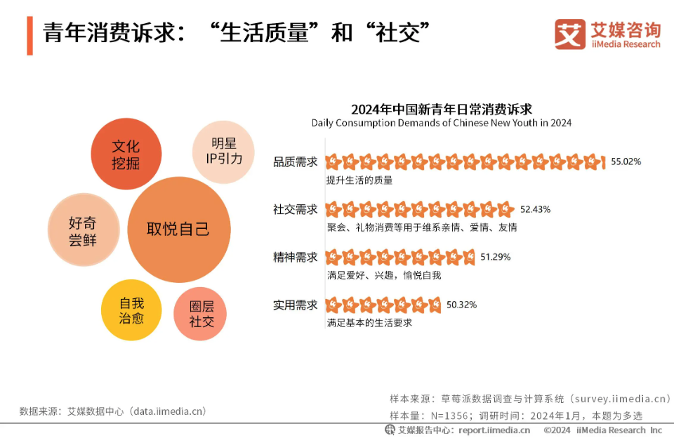 根据艾媒咨询最近发布的《2024~2025年中国兴趣消费趋势洞察白皮书》数据显示,超5成的新一代消费群体在生活必需品外,会在一定支出范围内购买兴趣喜好相关品、愉悦自我的产品。新一代消费者购买商品不再只为满足实用需求,也更多地关注商品的个性化特征、商品附加情感价值、文化内涵等。