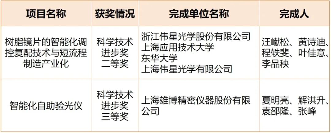 科学技术奖励授奖项目,由中国眼镜协会报送的两个项目上榜。 协会常务理事单位浙江伟星光学股份有限公司等联合申报的“树脂镜片的智能化调控复配技术与短流程制造产业化”项目荣获2024年度科学技术进步奖二等奖。 协会理事单位上海雄博精密仪器股份有限公司申报的“智能化自助验光仪”项目荣获2024年度科学技术进步奖三等奖。