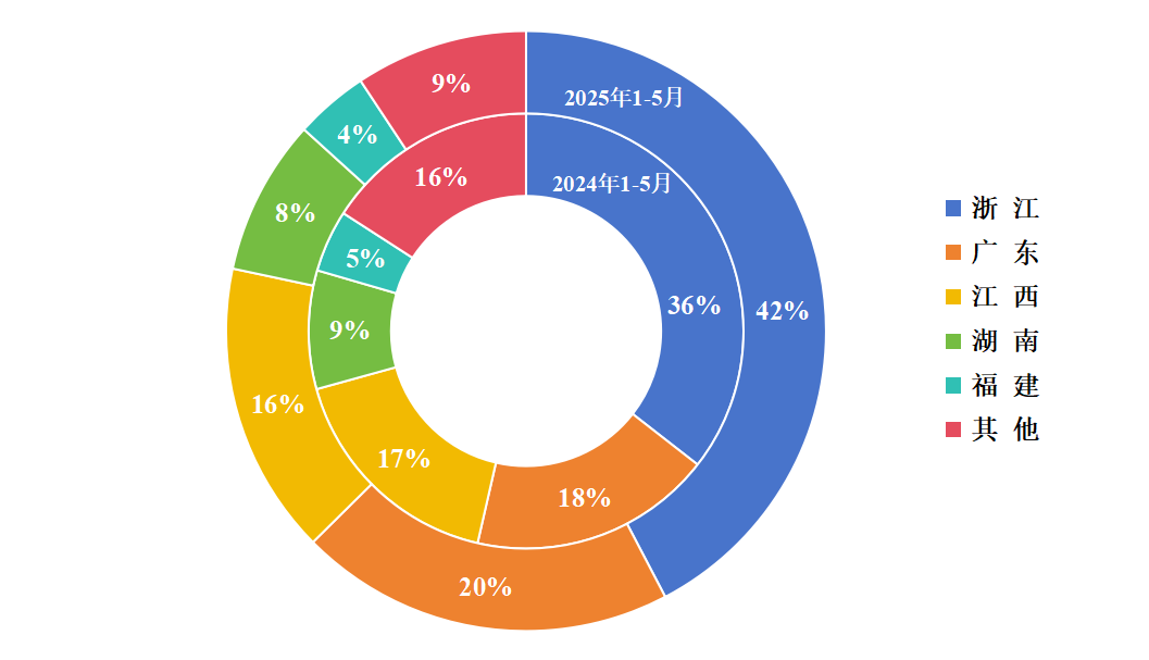 2025年1-5月规上企业照明器具制造出口交货值分地区占比