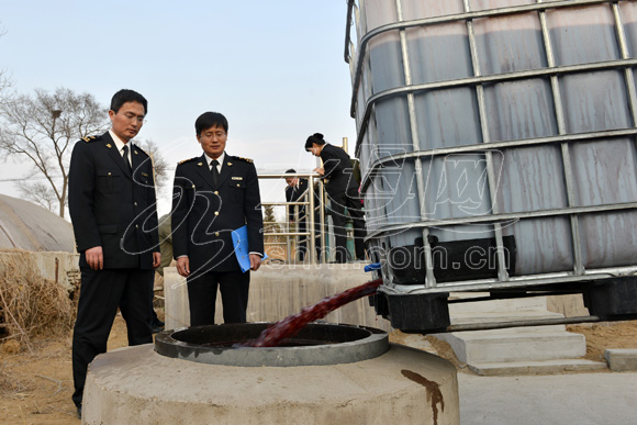 3月28日,在烟台海关和烟台出入境检验检疫局联合监督下,13350瓶不合格进口葡萄酒在蓬莱市碧海污水处理有限公司销毁。
