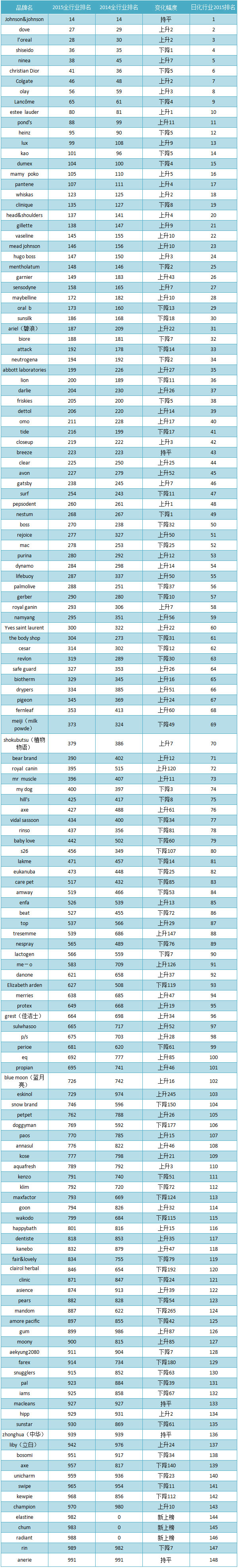 日前,《Campaign Asia-Pacific》和尼尔森(Nielsen)联合发布了2015年度“亚洲1000大品牌”报告,其中家庭清洁用品和个人护理用品品牌共148个品牌上榜,其中强生品牌以第14名的成绩占据日化榜第一的位置。多芬、欧莱雅、资生堂、妮维雅、克里斯汀迪奥、高露洁、玉兰油、兰蔻、雅诗兰黛,分别占据了日化榜前十。