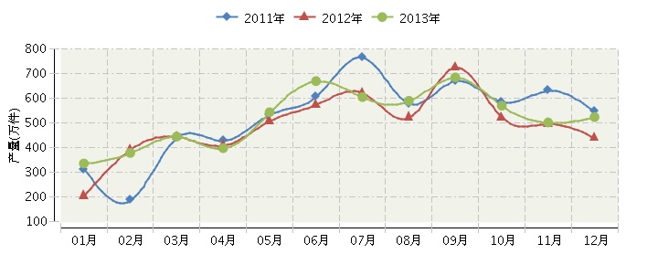 2013年全国皮革服装行业连续三年月度产量对比
