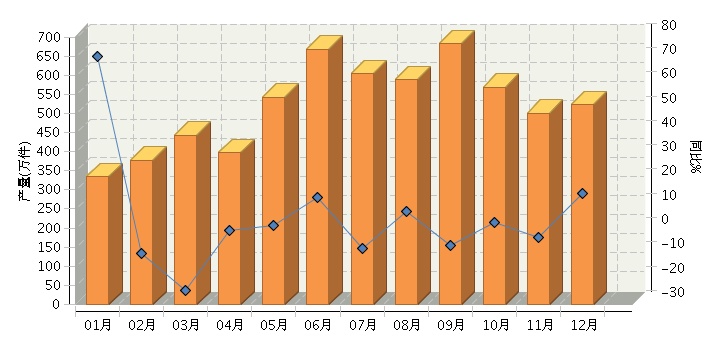 根据国家统计局公布数据,2013年全国皮革服装累计完成产量6,229.74万件,同比增长6.97%。其中: 12月份完成产量522.95万件,同比增长15.8%。2013年月度数据走势及同比增长情况如下图所示。