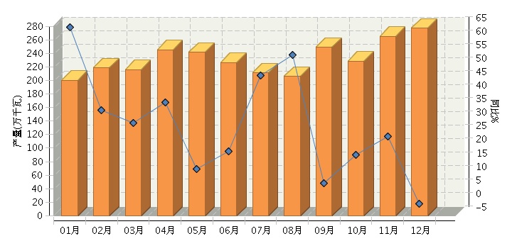 根据国家统计局公布数据,2013年全国太阳能电池行业累计完成产量2,740.65万千瓦,同比增长19.95%。其中:12月份完成产量277.66万千瓦,同比增长-0.71%。2013年月度数据走势及同比增长情况如下图所示。