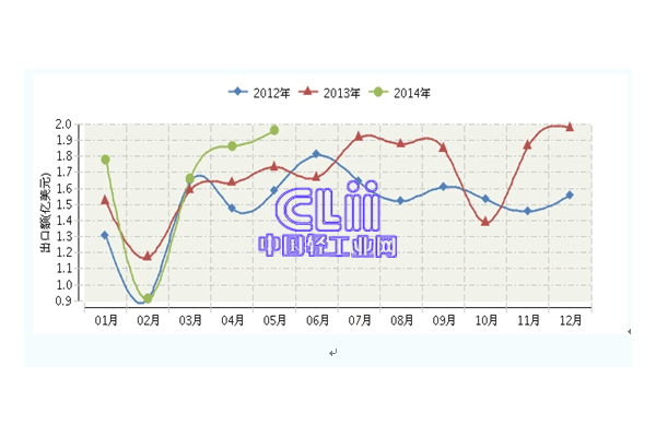 2014年1月~5月,全国缝纫机及零件行业累计完成出口额8.17亿美元,同比增长7.09%。其中:1月份完成出口额1.78亿美元,同比增长16.73%;2月份完成出口额0.92亿美元,同比增长-22.12%;3月份完成出口额1.66亿美元,同比增长6.43%;4月份完成出口额1.86亿美元,同比增长14.03%;5月份完成出口额1.96亿美元,同比增长13.13%。