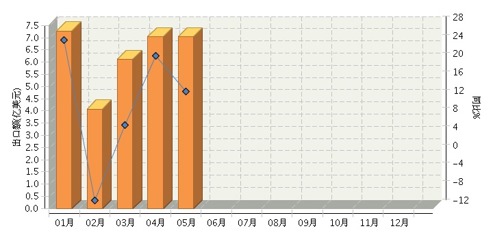 根据海关总署公布数据, 2014年1~5月,全国蓄电池行业累计完成出口额同比增长12.24%。其中: 5月份完成出口额7.03亿美元,同比增长13.63%。2014年全国蓄电池行业月度出口额及同比如下图所示。