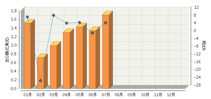 7月份完成出口额1.71亿美元,同比增长5.85%。