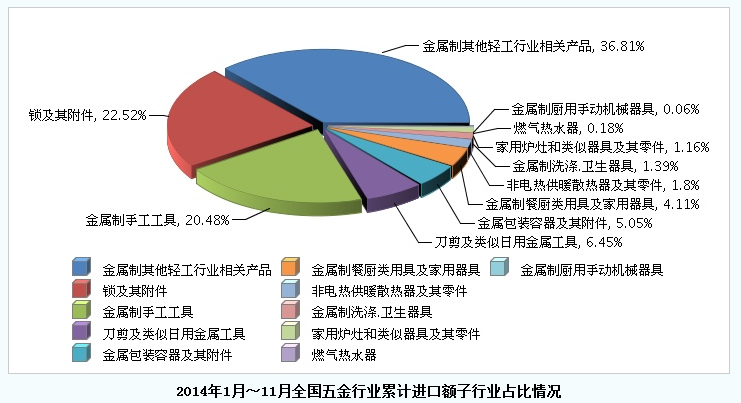 2014年1月~11月,全国五金行业累计完成进口额24.86亿美元,同比增长12.21%。11月份完成进口额2.29亿美元,同比增长3.06%。当月完成进口额基本与上月持平,但增速下降了3.7个百分点。