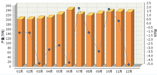 根据国家统计局公布数据,2014年1~12月,全国乳制品累计产量2651.81万吨,同比下降1.23%。月度数据走势及同比增长情况如下图所示。
