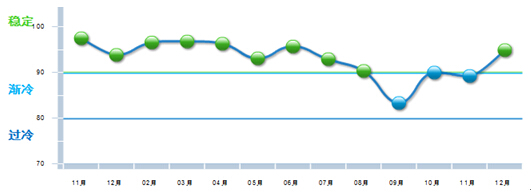 图 2013年11月—2014年12月食品制品行业出口景气指数变化态势
