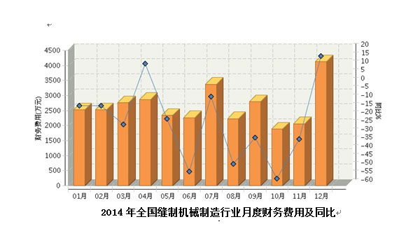 2014年1~12月,全国缝制机械制造行业累计完成财务费用31,718.30万元,同比增长-25.08%。其中:1月份完成财务费用2520.25万元,同比增长-12.69%;2月份完成财务费用2520.25万元,同比增长-12.69%;3月份完成财务费用2753.3万元,同比增长-23.76%;4月份完成财务费用2869万元,同比增长12.22%;5月份完成财务费用2340.5万元,同比增长-20.52%;6月份完成财务费用2259.3万元,同比增长-51.69%;7月份完成财务费用3372.1万元,同比增长-7.27%;8月份完成财务费用2226.7万元,同比增长-47.04%;9月份完成财务费用2791.5万元,同比增长-31.48%;10月份完成财务费用1885.2万元,同比增长-55.91%;11月份完成财务费用2058.1万元,同比增长-32.56%;12月份完成财务费用4122.1万元,同比增长16.73%。