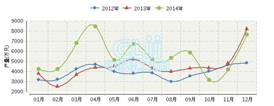 2014年,福建荧光灯累计产量54699.54万只,同比增长-4.29%。其中,12月份完成产量7655.35万只,同比增长-8.44%。