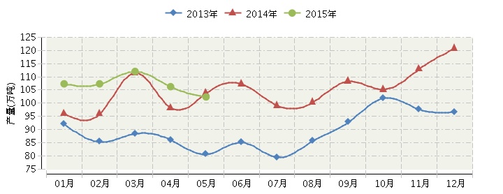 2015年全国合成洗涤剂行业连续三年月度产量对比