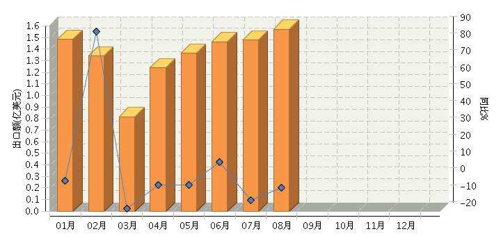 其中:8月份出口额1.57亿美元,同比下降6.13%。