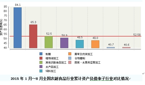 2015年1~8月,全国农副食品行业累计资产负债率为52.58%,同比增长-1.17%。其中,制糖累计资产负债率为84.06%,同比增长3.01%;植物油加工累计资产负债率为65.27%,同比增长-2.25%;其他农副食品加工累计资产负债率为52.54%,同比增长-0.97%;水产品加工累计资产负债率为50.87%,同比增长-0.7%;饲料加工累计资产负债率为48.5%,同比增长-2.03%;屠宰及肉类加工累计资产负债率为48.04%,同比增长-0.37%;谷物磨制累计资产负债率为40.7%,同比增长-1.13%;蔬菜、水果和坚果加工累计资产负债率为40.62%,同比增长-0.59%。