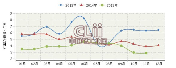 2015年1~11月,辽宁灯具及照明装置累计完成产量42.35万套,同比增长-20.62%。其中: 11月份完成产量2.88万套,同比增长-26.57%。