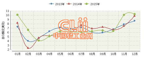 图 2015年全国陶瓷砖连续三年月度出口额对比