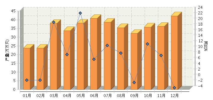 根据国家统计局公布数据,2016年1~12月,全国原电池及原电池组(折R20标准只)行业累计完成产量同比增长8.13%。其中:12月份完成产量同比增长-3.34%。2016年全国原电池及原电池组行业月度产量及同比如下图所示。