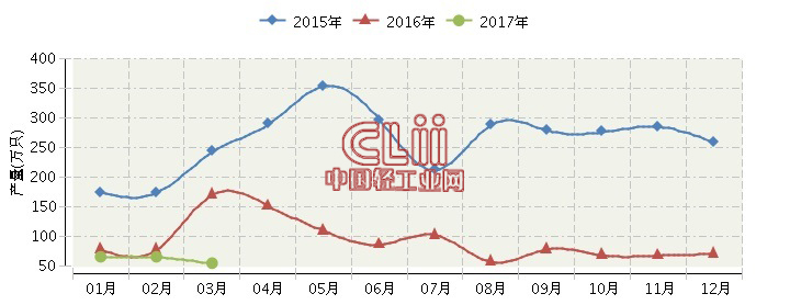 2017年1月~3月,上海荧光灯行业累计完成产量185.25万只,同比增长-43.44%。其中:3月份产量54.59万只,同比增长-68.09%。
