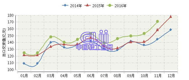 根据国家统计局公布数据:2016年1~11月,全国家具行业的累计出口交货值为1608.83亿元,同比增长4.58%。其中:11月份出口交货值同比增长5.67%。
