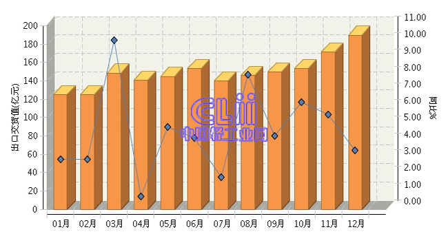 2016年全国家具行业月度出口交货值及同比