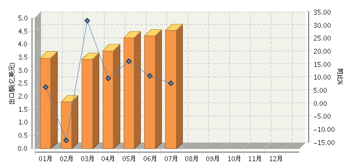 根据海关总署发布数据, 2017年1月~7月,全国本册印制行业累计完成出口额25.33亿美元,同比增长11.77%。其中:1月份完成出口额3.47亿美元,同比增长8.55%;2月份完成出口额1.79亿美元,同比增长-11.93%;3月份完成出口额3.42亿美元,同比增长34.1%;4月份完成出口额3.75亿美元,同比增长11.9%;5月份完成出口额4.24亿美元,同比增长18.48%;6月份完成出口额4.33亿美元,同比增长12.79%;7月份完成出口额4.53亿美元,同比增长9.99%。2017年全国本册印制月度出口额及同比增长趋势如下图所示。