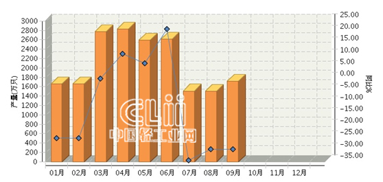 2017年1~9月,安徽荧光灯累计产量18,845.86万只,同比增长-9.32%。其中: 9月份完成产量1715.33万只,同比增长-29.64%。