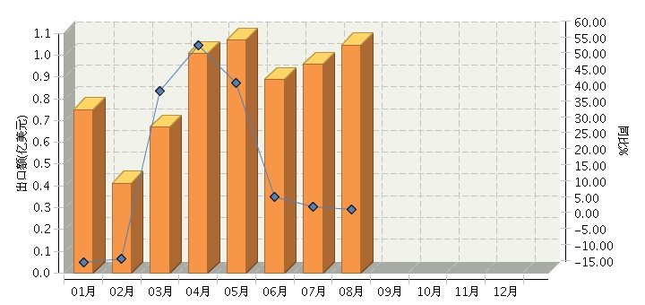 根据海关总署发布数据, 2017年1月~8月,全国游艺娱乐用品行业累计完成出口额6.69亿美元,同比增长13.48%。其中:1月份完成出口额0.75亿美元,同比增长-11.68%;2月份完成出口额0.41亿美元,同比增长-10.65%;3月份完成出口额0.67亿美元,同比增长42.09%;4月份完成出口额1.01亿美元,同比增长56.17%;5月份完成出口额1.07亿美元,同比增长44.44%;6月份完成出口额0.89亿美元,同比增长8.95%;7月份完成出口额0.96亿美元,同比增长5.64%;8月份完成出口额1.05亿美元,同比增长4.91%。