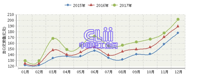 全国家具行业连续三年月度出口交货值对比