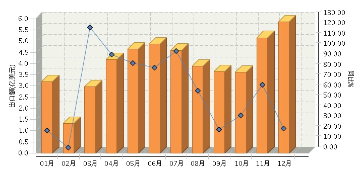 据海关数据显示,2017年全国陶瓷制固定卫生设备累计完成出口额42.54亿美元,同比增长38.72%。其中:12月份完成出口额5.86亿美元,同比增长23.58%。