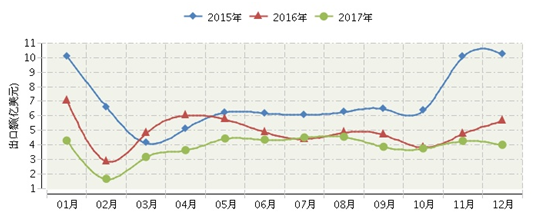 2017年我国陶瓷砖出口量价持续跌落,其中出口额下降幅度继续高于出口量降幅。据海关数据显示,2017年1~12月我国陶瓷砖累计出口金额44.26亿美元,同比下降19.98%;出口量9.08亿平方米,同比下降8.56%。从连续三年月度出口额对比情况看,2017年各月出口额基本低于上两年水平, 仅7月份出口微弱正增长