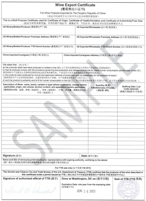 记者从国家质检总局获悉,经海关总署、质检总局与美国政府有关主管部门磋商达成一致,自2014年3月1日起,美国财政部烟酒税收贸易局将启用美国输华《葡萄酒出口证书》,作为美国输华葡萄酒的唯官方证书,不再签发目前的美国输华葡萄酒原产地证书、健康证书、卫生证书、真品证书及自由销售证书等证书。