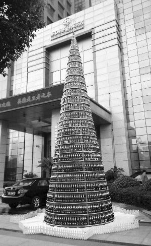 一进入12月,不少商家都会用圣诞树,提前营造圣诞气氛。最近,不少市民发现,常州奥体明都国际大饭店门前,出现一棵用啤酒瓶堆成的圣诞树,十分抢眼。