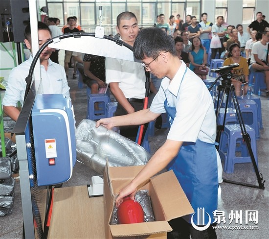 多种新型绿色缓冲陶瓷包装材料和器械首次在德化亮相,吸引了许多陶瓷和电商商家前来观展。陈先生最近正为自己的陶瓷运输难而犯愁,为了证实新型陶瓷包装材料的实用性,他特地带了作品到现场进行试验。量尺寸、挑箱子、注泡液、成型、试摔、拆封,在众人的见证下,拆封后的陶瓷作品竟然毫发无损。