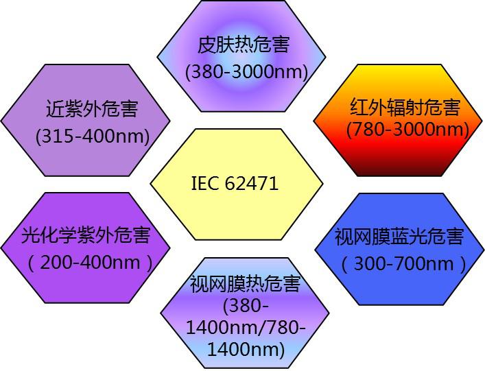 在国际电工委员会制定的IEC62471标准中规定了光辐射产品六方面危害的辐射限值。对于LED来说,最重要的是符合蓝光危害的辐亮度或辐照度限值。若LED光源或灯具符合低或无危害的辐射限值,即可认定该照明灯具没有光生物危害。