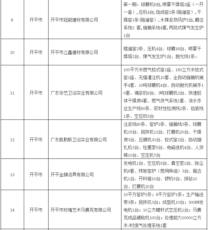 日前,江门市人民政府办公室在政府官网发布《江门市重点行业环境综合整治工作方案》。据江门市陶瓷生产企业清单显示,江门市现有陶瓷生产企业35家,其中新会区4家,恩平市20家,台山市2家,开平市8家,鹤山市1家。整治措施中指出,恩平市沙湖陶瓷集聚区陶瓷生产线总体规模须控制在59条以内,横陂陶瓷集聚区陶瓷生产线总体规模须控制在18条以内,严禁审批(备案或核准)超出环境容量的陶瓷生产线。