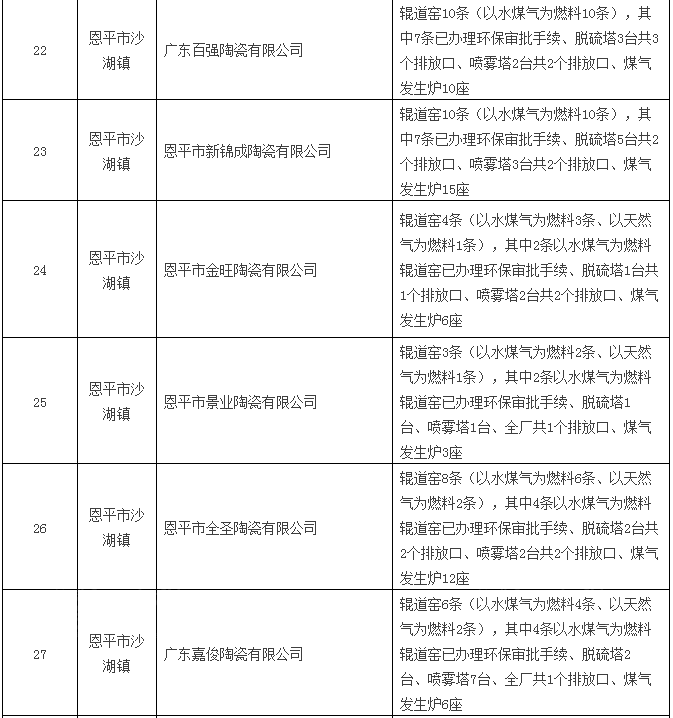据悉,恩平沙湖镇有13家陶瓷生产企业,共71条生产线,其中8条天然气为燃料的生产线,63条水煤气为燃料的生产线中46条办理了环评审批,而横陂镇4家陶企共15条生产线,天然气为燃料的生产线4条,其中11条水煤气为燃料的生产线中10条办理了环评手续。