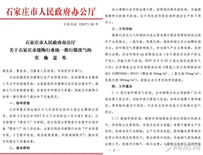5月23日,石家庄市人民政府办公厅发布《关于石家庄市建陶行业统一推行煤改气的实施意见》,将对全市(高邑县、赞皇县、行唐县)现有34家陶瓷企业实施天然气改造。