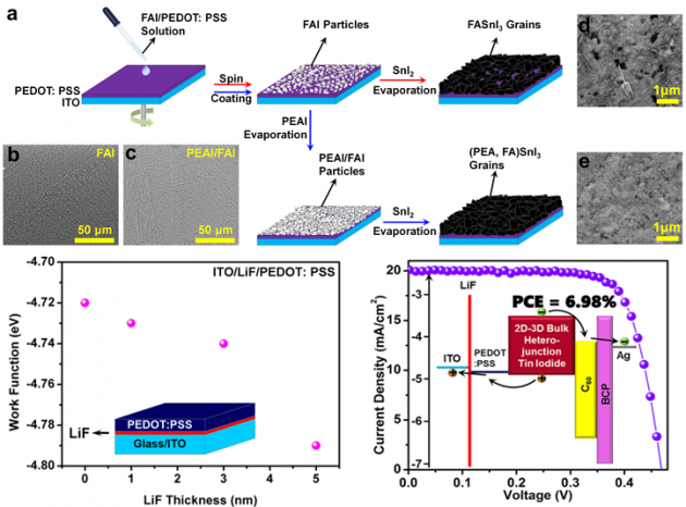 对于环境友好且稳定性更高的非铅钙钛矿材料的开发和光伏器件应用是国内外新的研究热点。近几年来,西安交大吴朝新教授团队持续对于环保型非铅钙钛矿太阳能电池深入研究,取得了一系列重要成果,今取得锡基钙钛矿太阳能电池6.98%的光电转换效率,为环境友好非铅钙钛矿太阳能电池的应用推进作出重要贡献。