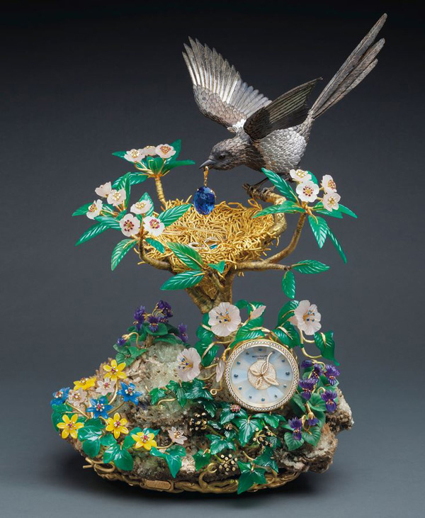 该座钟以珍珠母贝表盘搭配蓝宝石时标,表盘中央镶有钻石,黄金圆形表壳被置于雕刻黄金树上,树镶于一块大天然水晶石上。硕大的天然水晶底座上,以钻石、红宝石、紫水晶、粉水晶和彩色玛瑙镶嵌而成的繁花争妍斗丽;金树树梢上的黄金“聚宝鸟巢”被群花拥簇,巢中以黄金镶钻而成之“珍宝”:剪刀、眼镜、顶针、红宝指环和珐琅安全别针;一只寓意欢喜吉祥的黄金镶银喜鹊,叼来一颗硕大的104.75卡拉坦桑石,为其“聚宝鸟巢”又添一宝,意境俏皮可爱。