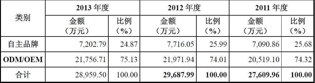 数据显示,公司ODMOEM代工生产业务贡献的营业收入超过7成,并且呈现上升趋势,而自主品牌业务的占比很小。