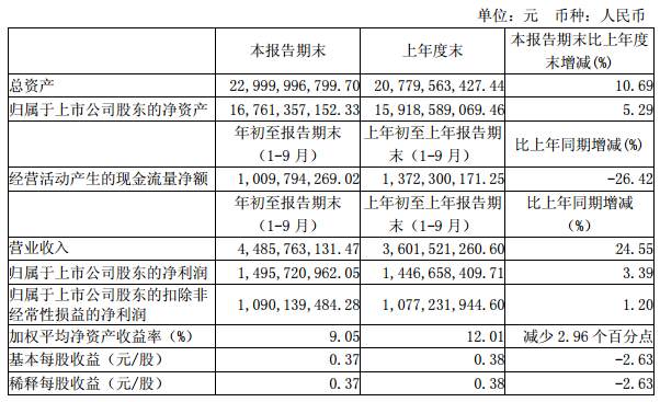 公司2016年1-9月实现营业收入44.86亿元,同比增长24.55%;归属于上市公司股东的净利润14.96亿元,同比增长3.39%。
