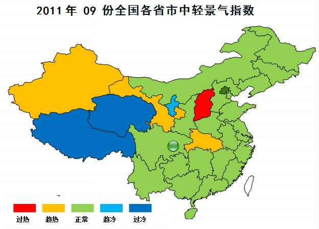 2011年9月份中轻景气指数地图显示,中轻山西景气指数为128.16,为本月度指数最高省份,新疆、甘肃、湖北三省份景气指数趋热,分别达到113.86、112.71、111.28,大部分省份中轻景气指数保持稳定,西藏、青海、宁夏等地景气指数偏冷。