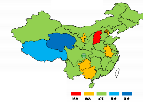 2011年10月份中轻景气指数地图显示,大部分省份中轻景气指数保持稳定,中轻山西景气指数为120.25,近3个月来一直保持轻工景气指数过热,北京、天津、宁夏、安徽、贵州、广西等省份景气指数趋热,西藏偏冷,青海过冷。