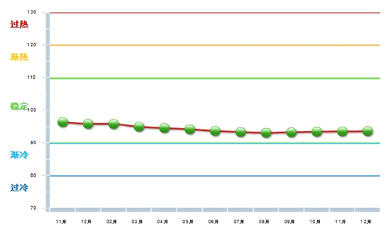 12月份中轻景气指数为93.59,比上月上涨0.1,位于“稳定”区域(参见图1-1)。